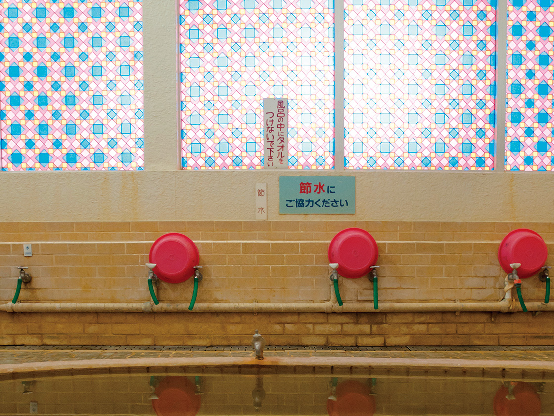 のれんをくぐった先には、ピンク色に染められたお風呂場があった。赤、青、ピンクに黄色、色とりどりのガラスをすり抜けた光が、おだやかにお風呂場を包んでいる。かかり湯でお湯の熱さを馴染ませながら、体を清めて湯船へ。お湯の静かな流れに身をゆだねていると、まちの真ん中にいることを忘れてしまう。